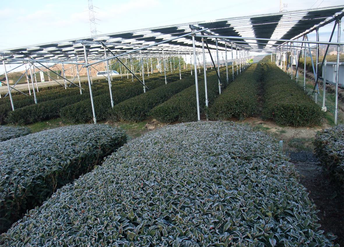 Our plantations are grown under the solar panels. Solar panel generates electronic power , makes high quolity of matcha or gyokuro, and protects fresh leaves from threat of frost.